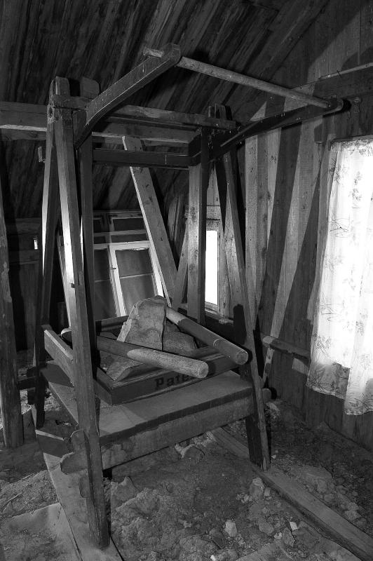 Klesrulle for duker, laken og dynetrekk. Denne står på Sagbakken hos Per Jensen ved Svingen i Skoger. Se artikkel i Historielagsnytt nr, 1 2006..
