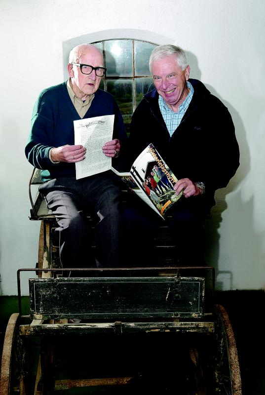 Olaf Rustand (til venstre) og Nils Otto Larsen viser fram hvert sitt eksemplar av Historilagsnytt. Bildet er tatt i 2006 da Historilagsnytt var 25 år. Olaf Rustand holder den første utgaven (som kom ut julen 1982) som var ført i pennen av ham i egenskap av Historielagets sekretær. Nils Otto Larsen var formann i 1982.
