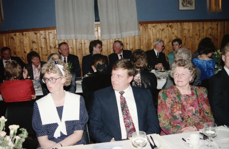 Bilde fra Skoger Ungdomslags markering av at laget har eksistert i 100 år med jubileumsfest på Skogvang 14. mars 1992. I bakgrunnen fra v. Erik Juel, Elisabeth Juel Ramnæs, Anders Røed, Berit og Per Skjeldrum, Julius Gundesø, ukjent. I forgrunnen Gro og Steinar Lunda, Margrethe Lunda.