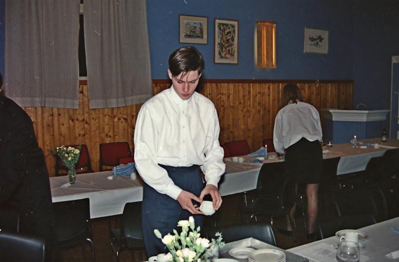 Bilde fra Skoger Ungdomslags markering av at laget har eksistert i 100 år med jubileumsfest på Skogvang 14. mars 1992. I festkomiteen var lagets unge medlemmer. Her Christian Johnsrud Madsen.