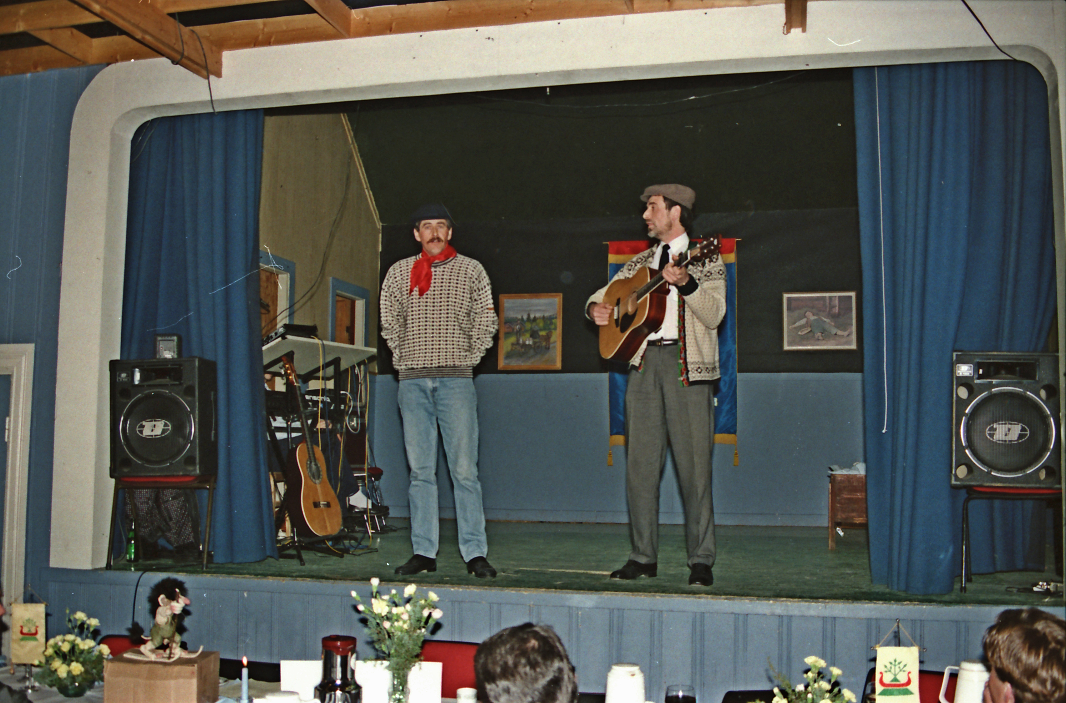 Bilde fra Skoger Ungdomslags markering av at laget har eksistert i 100 år med jubileumsfest på Skogvang 14. mars 1992. Ragnar Lehn og Stein-Erik Bjørnerud framfører sangen om Skogvang, med tekst av Ragnar Lehn.