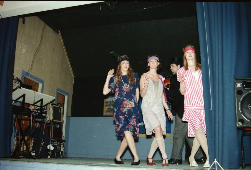 Bilde fra Skoger Ungdomslags markering av at laget har eksistert i 100 år med jubileumsfest på Skogvang 14. mars 1992. Revyen skulle speile tiårene som var gått. Her litt charleston fra 1920-årene ved Elisabeth Knudsen, Birgit Bonden og Christin Borge Johansen. I bakgrunnen akkompagnatør Stein Erik Bjørnerud.