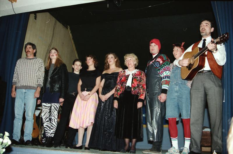Bilde fra Skoger Ungdomslags markering av at laget har eksistert i 100 år med jubileumsfest på Skogvang 14. mars 1992. En jubileumsrevy som speilet ti-årene som var gått siden ungdomslagets oppstart ble framført av Ragnar Lehn, ? Vegard Bråthen, Birgit Bonden, Elisabeth Knudsen, Inger Hyllseth, Per-Terje Guriby, Elisabeth Juel Ramnæs og Stein-Erik Bjørnerud.