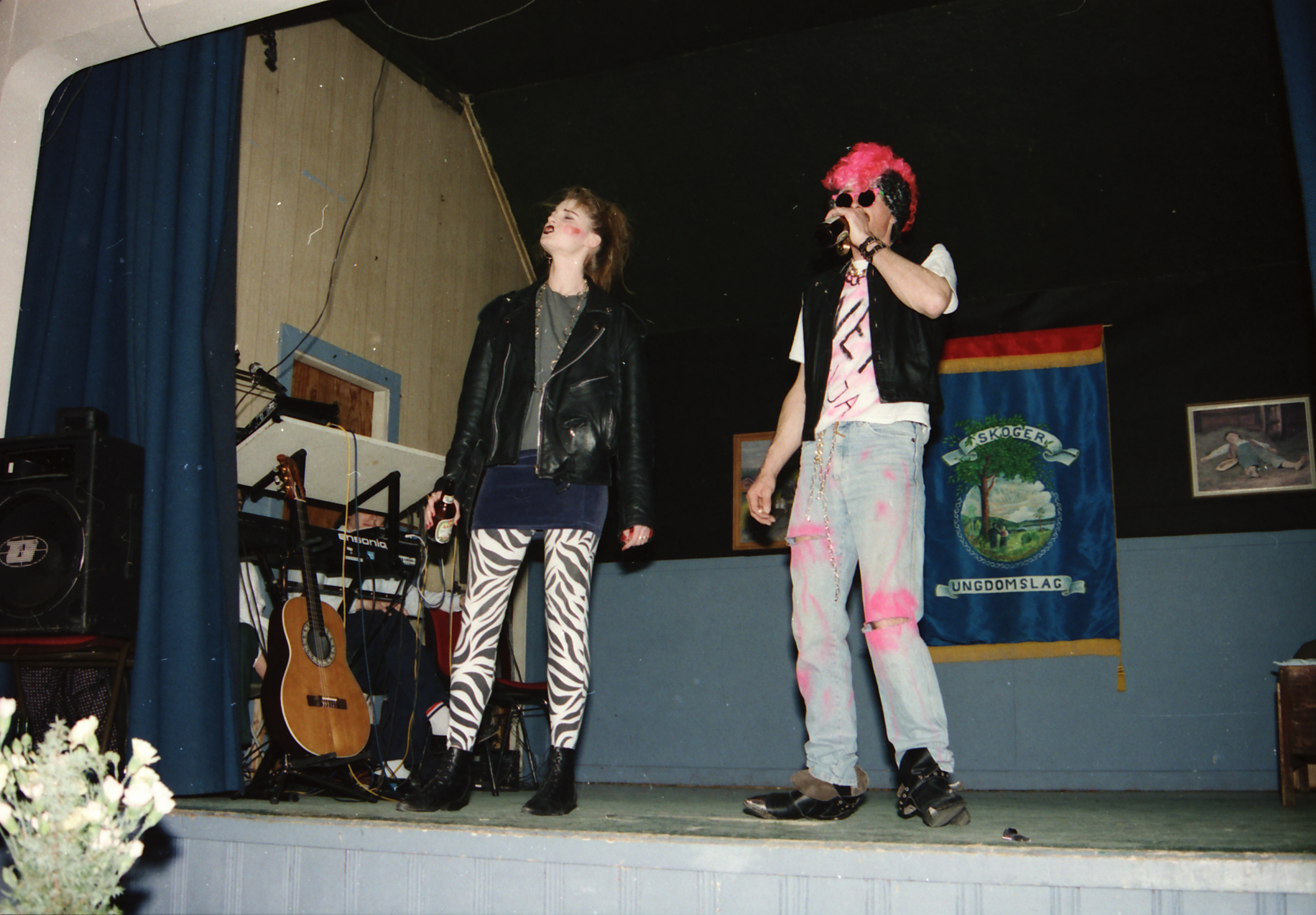 Bilde fra Skoger Ungdomslags markering av at laget har eksistert i 100 år med jubileumsfest på Skogvang 14. mars 1992. Revyinnslag med punkere fra 1980-årene: Ukjent ung dame og Ragnar Lehn.