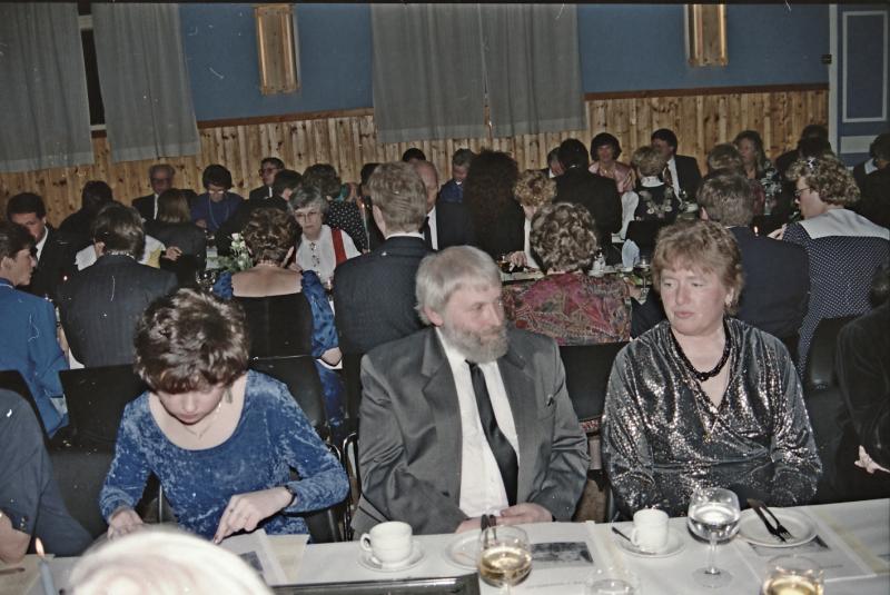 Bilde fra Skoger Ungdomslags markering av at laget har eksistert i 100 år med jubileumsfest på Skogvang 14. mars 1992. Midt i bildet, rektor ved Skoger skole, Bjørn Eriksen.