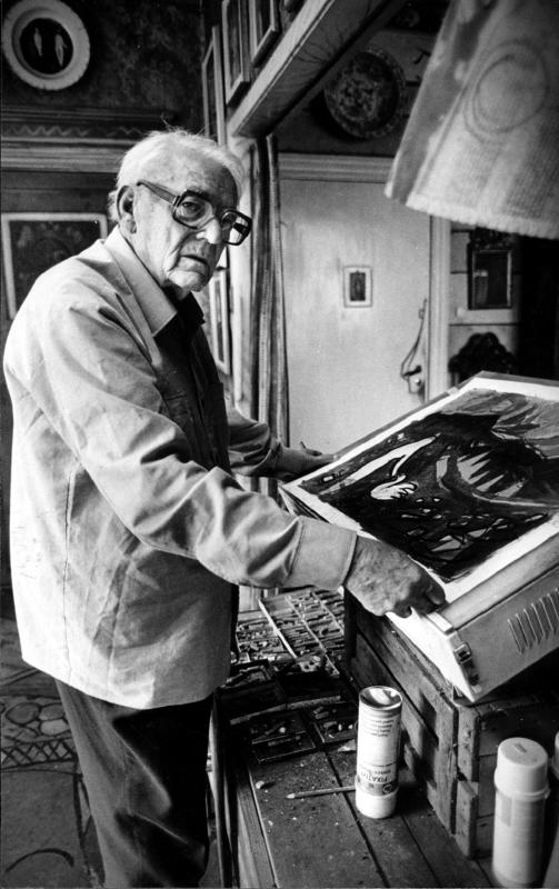 Dette er kunstmaleren Kai Fjeld, her mellom to stuer i sitt "kråkeslott" i Strandveien på Lysaker forteller hans niese, Trine Borge Johansen. Fra sin fetter, Sindre Fjeld, har hun fått følgende utfyllende opplysninger: "Motivet på silketrykket som ligger på lysbordet, heter "Menneske". Det finnes i 8 ulike varianter, alle laget i 1984. Fotografiet er tatt av fotograf Sverre Bergli, antakelig i 1984. Kai Fjeld, 1907 - 1989.