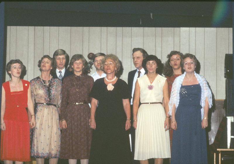 Fra 90 års jubileumsfesten med revy Fra venstre: Turid Skjeldrum, Ella Hindhamar, Knut Ole Røed, Marit Holmen, Jan Elgvang, Inger Hyllseth, Karl Johan Knudsen, Inger Juel Hoven, Halldis Christiansen, Randi Engen