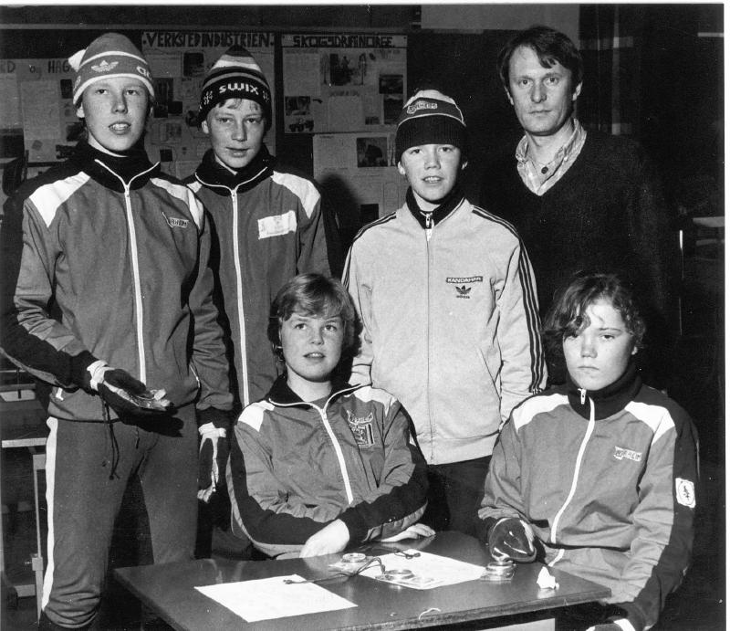 Fra venstre bakerst kjenner vi igjen: Erik Saugerud, Lars Baklid, Øivind (Andersen) Bergstrand og Henning Gaarder (o-leder) Foran: Kjersti Sommerstad Juveli og Merete Ruud Bildet er tatt ca. 1980