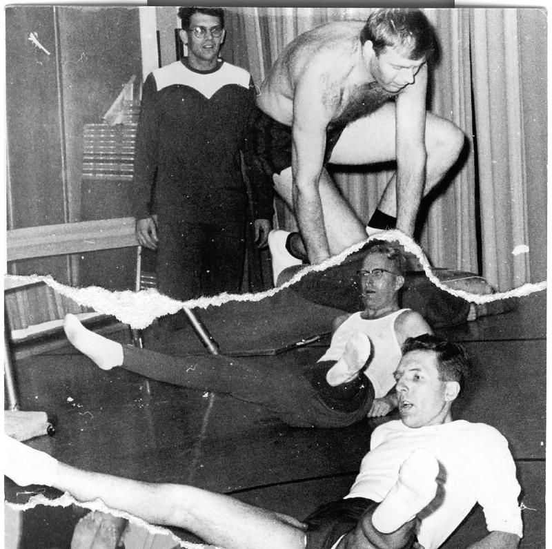 Hans Haveraaen var instruktør på et mosjonssparti som ble drev et i regi av eldres avdeling i KIL Han ser her på Arvid Sanders som hopper på bukk. Under i forgrunn Elling Eskerud, bak Kåre Arntsen trimmen var i gymsalen på Konneud skole.