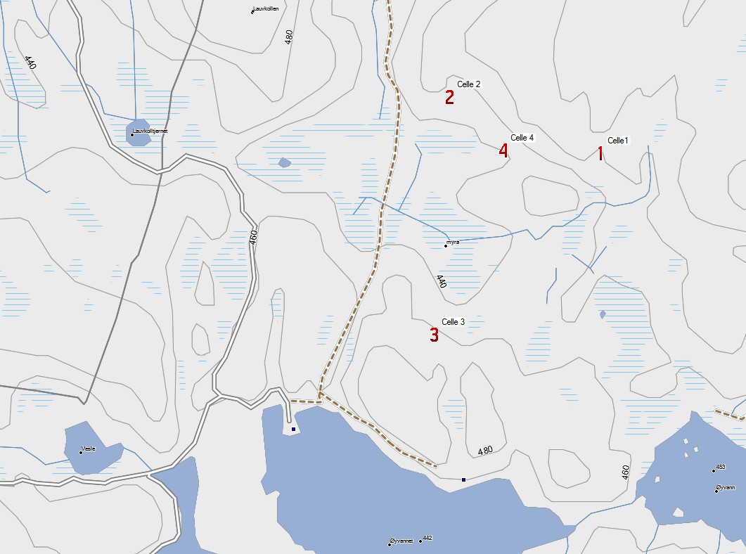 Bjørn Revetal (til venstre) og Johnny Kortvedt utenfor Celle 3 ved en skogtur i 1964. GPS/UTM-koordinatene til cellene finner du her: Celle 1: 32 V 562774 6612684 Celle 2: 32 V 562345 6612837 Celle 3: 32 V 562311 6612160 Celle 4: 32 V 562499 6612687 I WGS84-systemet er posisjonene (i grader med desimaler): Celle 1: 59,647522 10,113642 Celle 2: 59,648960 10,106078 Celle 3: 59,642887 10,105275 Celle 4: 59,647590 10,108765