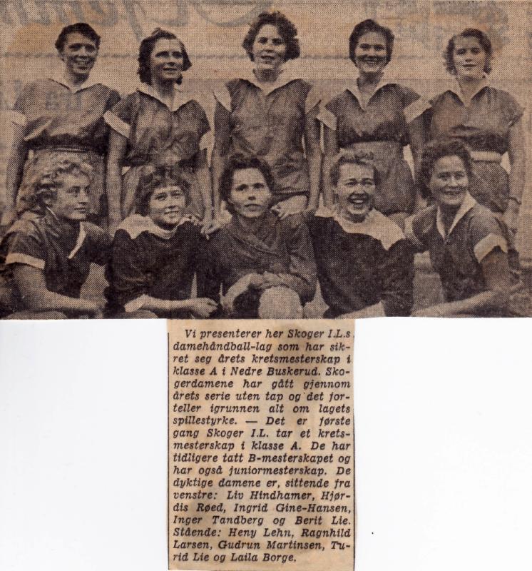 Teksten i artikkelen: Vi presenterer her Skoger I.L.s, damehåndball-lag som har sikret seg årets kretsmesterskap i klasse A i Nedre Buskerud. Skogerdamene har gått gjennom årets serie uten tap og det forteller igrunnen alt om lagets spillestyrke. - Det er første gang Skoger I.L. tar et kretsmesterskap i klasse A. De har tidligere tatt B-mesterskapet og har også juniormesterskap. De dyktige damene er: Sittende fra venstre: Liv Hindhamer, Hjørdis Røed, Ingrid Gine-Hansen,Inger Tandberg og Berit Lie. Stående: Heny Lehn, Ragnhild Larsen, Gudrun Martinsen, Turid Lie og Laila Borge. Opplysninger fra Solveig Arenth: "Bildet av håndballdamene er fra 1958. Den gang spilte vi utendørs og våre hjemmekamper ble spilt på Sletta der en del av fotballbanen ble merket opp til håndball. forøvrig så var overordnet organ Nedre Buskerud håndballkrets, noe som senere ble Buskerud håndballkrets - nå Region Sør."