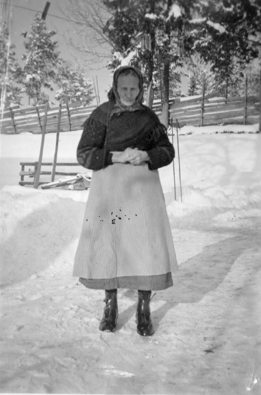 Dette bildet er tatt i Solbakken ca 1940. Personen på bildet er Grethe Nilsen Haugen på sine eldre dager. Hun bodde på Haugen, et småbruk ved Vestbygda skole. Hun var moren til Magna, som bodde i Solbakken.