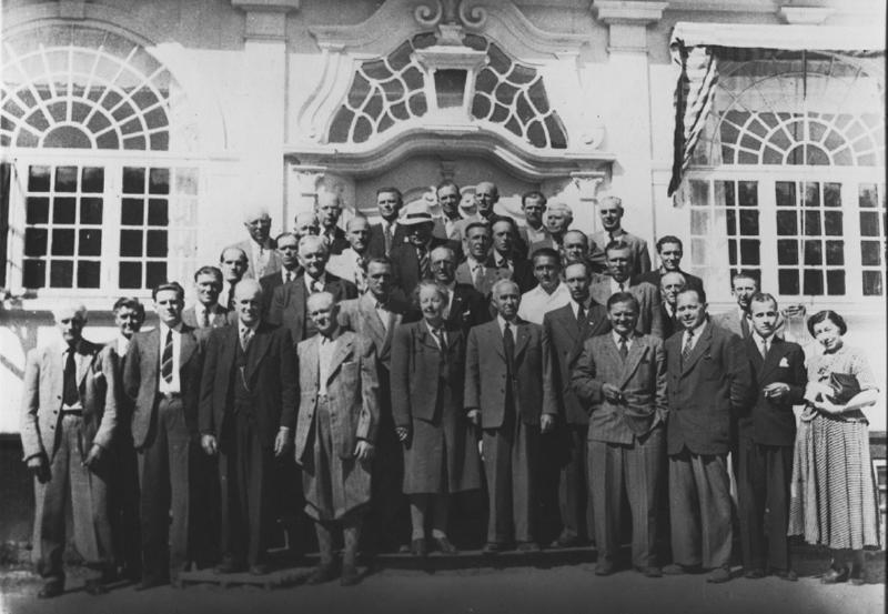 Dette er kommunestyret i Skoger i perioden 1938-1940, og de gikk på igjen etter krigen i 1945. Bildet er tatt foran hovedinngangen på Austad gård som var herredshuset i Skoger.