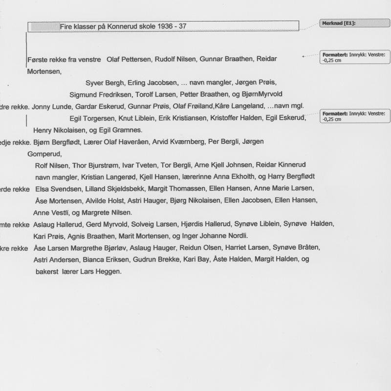 Fire klasser på Konnerud skole 1936 - 37 Første rekke fra venstre Olaf Pettersen, Rudolf Nilsen, Gunnar Braathen, Reidar Mortensen, Syver Bergh, Erting Jacobsen, ... navn mangler, Jørgen Prøis, Sigmund Fredriksen, Torolf Larsen, Petter Braathen, og BjømMyrvold Andre rekke. Jonny Lunde, Gardar Eskerud, Gunnar Prøis, Olaf Frøiland,Kåre Langeland, ...navn mgl. Egil Torgersen, Knut Liblein, Erik Kristiansen, Kristoffer Halden, Egil Eskerud, Henry Nikolaisen, og Egil Gramnes. Tredje rekke. Bjøm Bergflødt, Lærer Olaf Haveråen, Arvid Kværnberg, Per Bergli, Jørgen Rotf Nilsen, Thor Bjurstrøm, Ivar Tveten, Tor Bergli, Arne Kjell Johnsen, Reidar Kinnerud navn mangler, Kristian Langerød, Kjell Hansen, lærerinne Anna Ekholth, og Harry Bergfiødt Fjerde rekke Elsa Svendsen, Lilland Skjeldsbekk, Margit Thomassen, Ellen Hansen, Anne Marie Larsen, Åse Mortensen, Alvilde Holst, Astri Hauger, Bjørg Nikolaisen, Ellen Jacobsen, Ellen Hansen, Anne Vestli, og Margrete Nilsen. Femte rekke Aslaug Hallerud, Gerd Myrvold, Solveig Larsen, Hjørdis Hallerud, Synøve Liblein, Synøve Halden, Kari Prøis, Agnis Braathen, Marit Mortensen, og Inger Johanne Nordli. Bakre rekke Åse Larsen Margrethe Bjørløv, Aslaug Hauger, Reidun Olsen, Harriet Larsen, Synøve Bråten, Astri Andersen, Bianca Eriksen, Gudrun Brekke, Kari Bay, Åste Halden, Margit Halden, og bakerst lærer Lars Heggen.