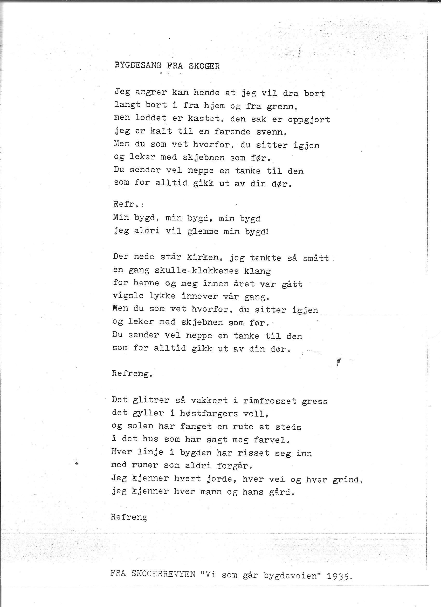 Den gamle Skogersangen fra Skogerrevyen "Vi som går bygdeveien" fra 1935. Under alternative filer ligger en MP3 lydfil med siste verset sunget av Hans Steen. Dette er et opptak gjort til og brukt i en film fra landbruket i Skoger i 1985. Lydfilen er hentet ut fra den digitaliserte versjonen av filmen. Det kan hende avspilling på håndholdte enheter som telefoner og nettbrett, ikke vil fungere.