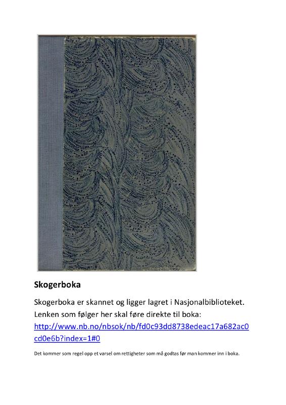Skogerboka ble utgitt i 1931. Nytt opplag på 1960-tallet. Boka er skannet av Nasjonalbiblioteket og er lagret der. Her ligger kun ei PDF-fil med lenke til boka i Nasjonalbiblioteket. Om tilblivelsen av Skogerboka står det: Den av herredet nedsatte komitè for Skogerboken bestod oprindelig av: Jørgen Andvik, gårdbruker, Ths. Bjerknes, gårdbruker, T. O. Lønnerud, bankdirektør, F. C. Blichfeldt, gårdbruker H. C. Egge, kontorchef, og er senere tiltrådt av: Gustav M. Olsen, agent, Arne N Anchersen, disponent, Chr. Juel, gårdbruker, Jørgen Kopperud, gårdbruker. Ths. Blerknes, Jørg. Andvik og Arne N. Anchersen har fulgt efter hverandre som komitens formenn. Veiledning: Klikk «Last ned» orginalfila. Et avlangt vindu kommer opp nederst på skjermen (i Windows 10), klikk «Åpne» og pdf-fila åpnes på egen maskin. Under forsidebildet ligger ei blå lenke, klikk på denne fører til åpning av boka i Nasjonalbiblioteket. Klikk «OK» på varselet om opphavsrettigheter og det er klart for å søke eller bla i boka.