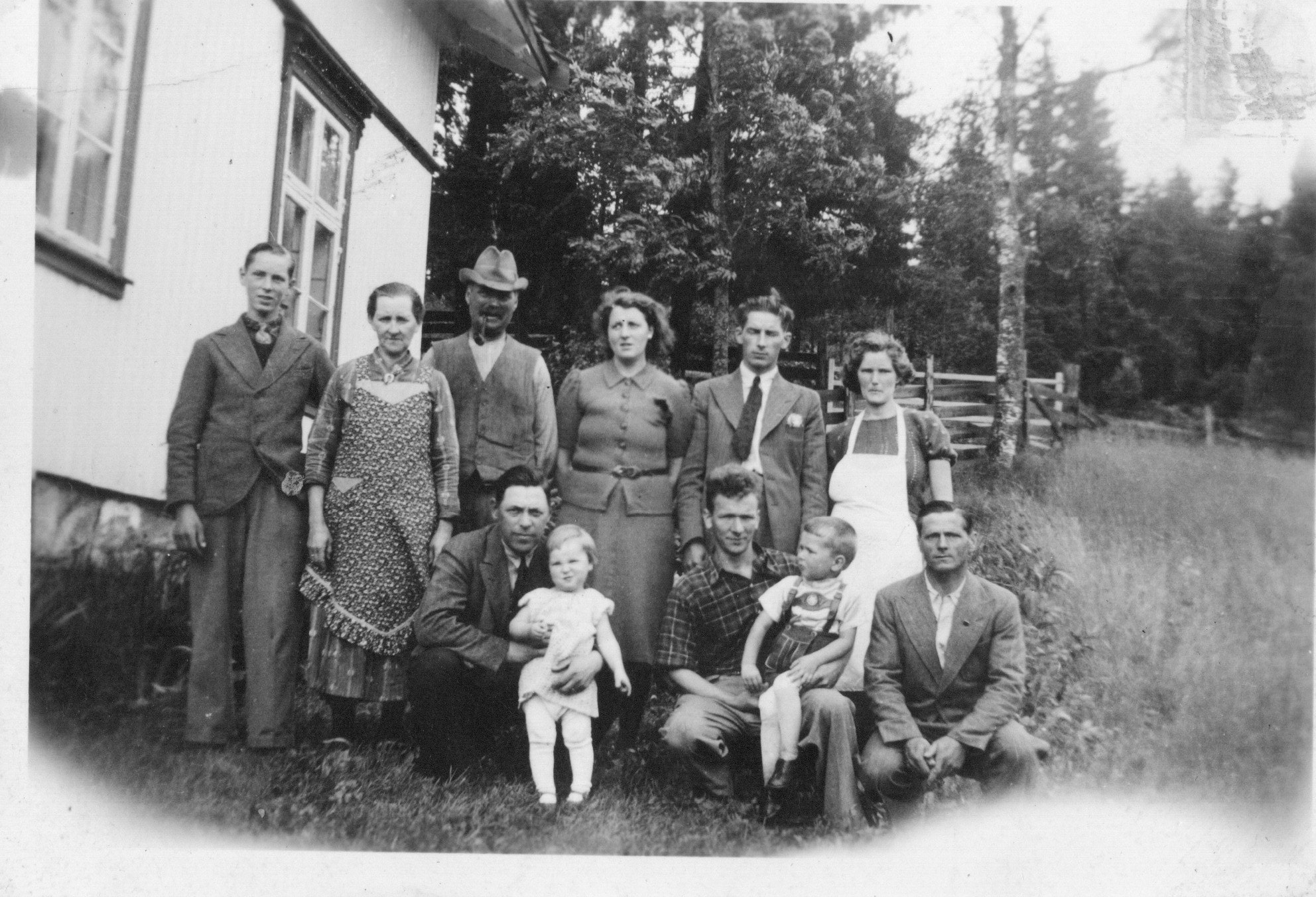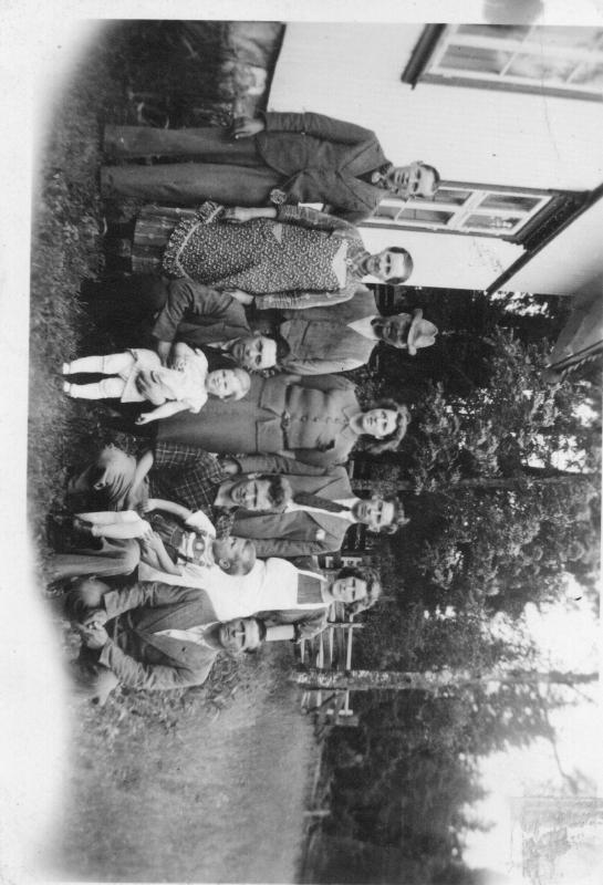 Dette bilde er tatt i Solbakken, et småbruk i Svingen ca 1930. Bak fra venstre: Harald, Magna, Martin, U,Karl, Ella Foran fra venstre: U, U, U, U, U Magna og Martin Solbakken eide Solbakken og de var foreldre til blant annet Harald, Karl, Ella. De forøvige er ukjente.