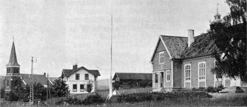 Bildet er tatt i 1930 eller før. Kirke skole festlokale bygdesenter