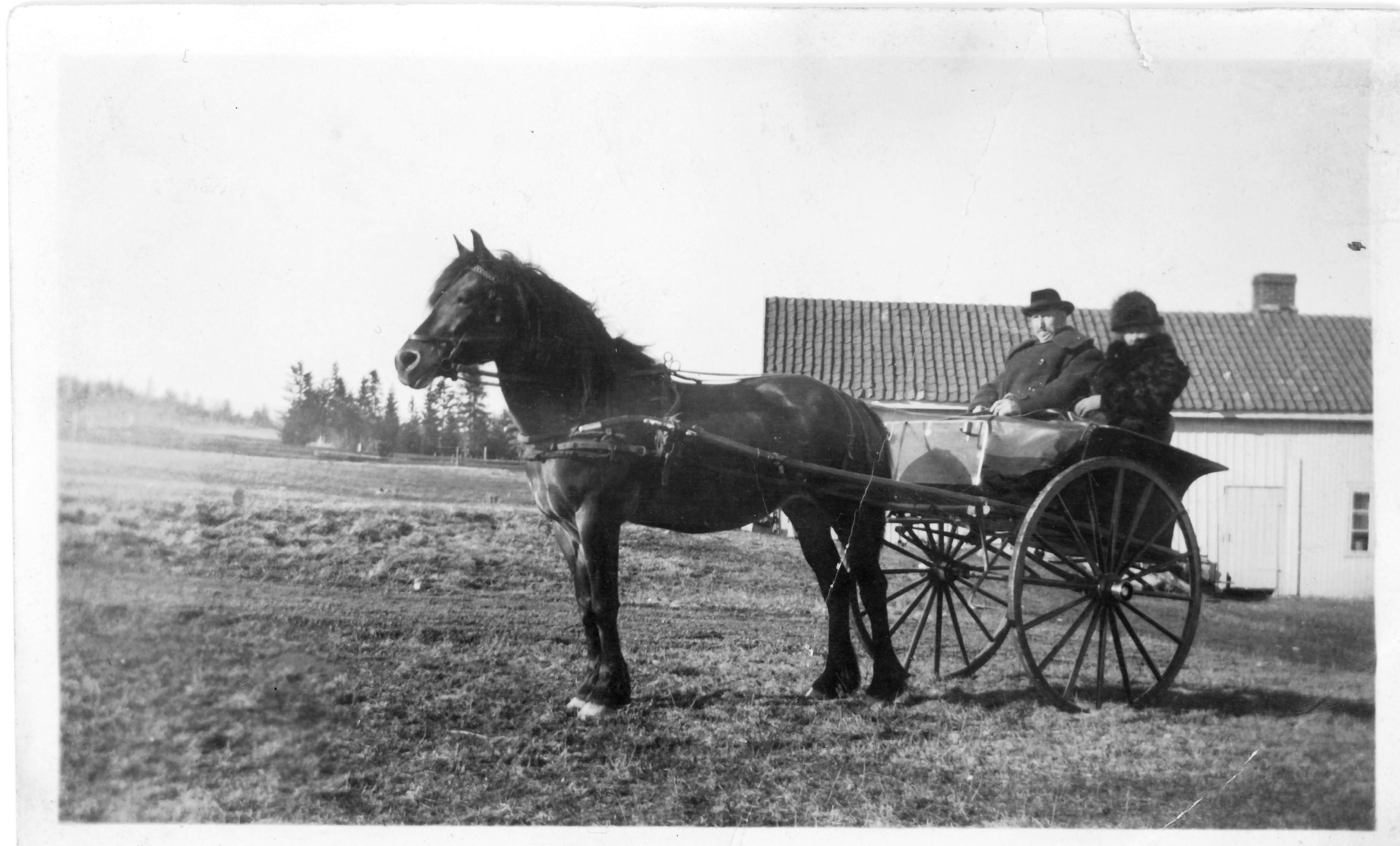 Hest og vogn på tunet. I vognen sitter Hanna & Johannes Johnsrud klar for tur.