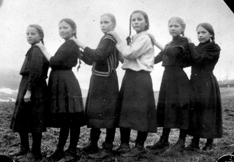 Skolejenter fra Flåten skole i Vestbygda Skoger. Fra venstre: Bergliot Jordbræk, Kirsten Berg, ukjent fra Plassane, Ebekka Fossen, Kirsten Knutsen, Helga Amundsen