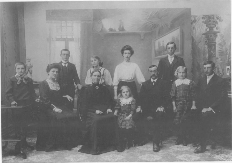 Lars Nilssen Meland (1864 - 1920) og hans kone Gyda Meland (f. 1866) med sine barn. Bildet er tatt ca. 1910. Fra venstre bak: Andreas (f. 1895), Synnøve (f. 1893), Sigrid (f. 1889) og Anders (f. 1890) Fra venstre foran: Ingvald (f. 1900), Ragnhild (f. 1898), Gyda, Gudrun (1904 - 1918), Lars, Anna (1902 - 1929) og Nils (f. 1887). Nils var sønn av Gyda og Anders Meland som var bror av Lars Meland. Lars giftet seg med Gyda etter brorens død. Lars Nilssen Meland kom fra Balestrand i Sogn og kjøpte Gunnarsrud i Skoger i 1901. Ytterligere opplysninger om familien finnes i Skogerboken som ble utgitt i 1931.