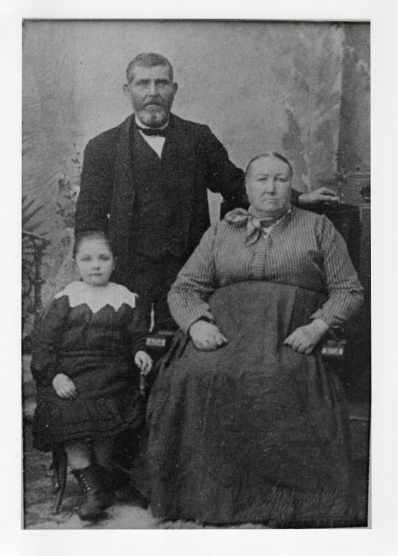 Andreas Johnsen Hugstet og Karen Johnsen Hugstet (f. Olsdatter) med barnebarnet Anna Øgren (f. Martinsen) foran. Karen og Andreas bodde på Hogstet, en liten boplass i skogen over Glorup og Engelkor gård. Foto er tatt ca i år 1905.
