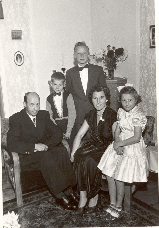 Dag Pettersvolds konfirmasjon i 1956. Fra v. Ivar Pettersvold - Håkon - Dag - Sittende: Asta og dattra Elin