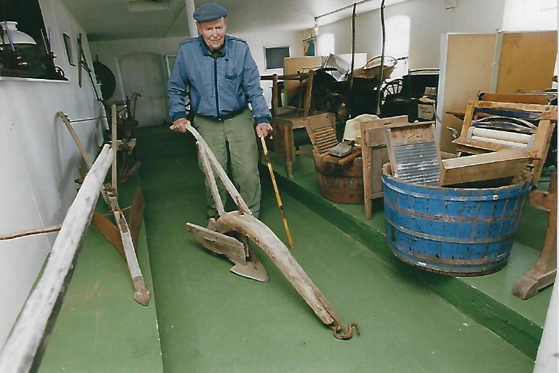 Tekst: Per Runar Thoresen "Museumsbestyrer" Jørgen Borge på Bygdemuseet på Borge. Han holder en gammel treard fra 1800 tallet