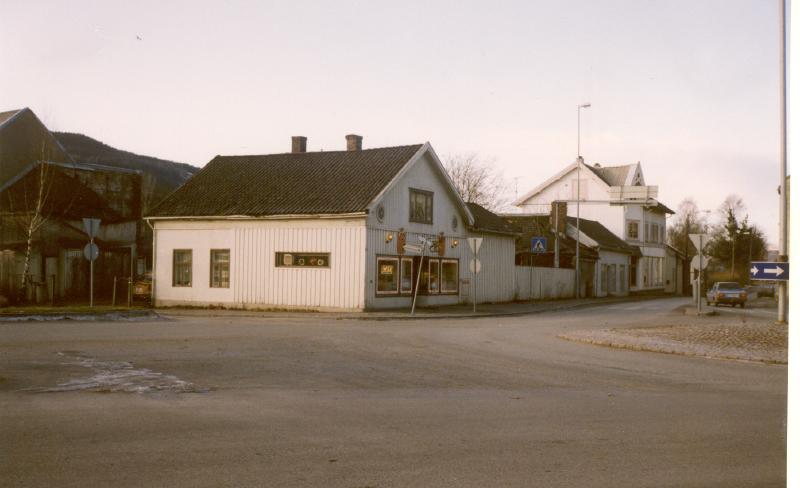 Thonhjørnet - Bakeriutsalg. Det gamle bakeriet brandt i april 1959. Der hvor plankegjerdet går lå et hus hvor Per thon bodde. En herrefrisør, Reidar Holt. En skomaker, Henrik Gulbrandsen. Noe av murveggen etter brannen i 1959+ står forsatt. Meldøren synes ennå.