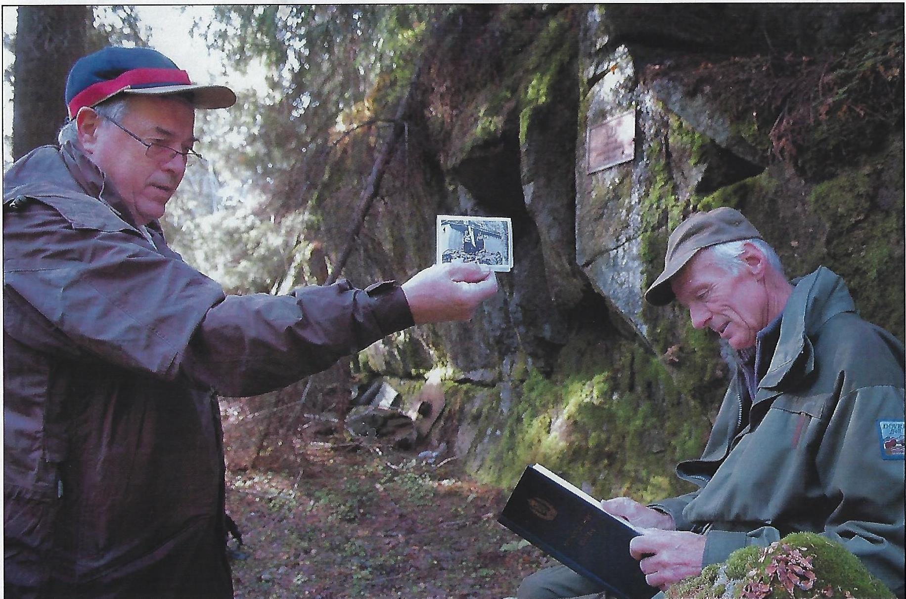 Tekst: Per Runar Thoresen Bildet tatt ved celle 2 okt 2007. 6-7 SKH medlemmer hadde en vandring for å oppdatere seg på celle. Per Runar Thoresen til venste og Tor Jahren studerer bilder og Vestskogjegernes Minnebok. Legg merke til metallskiltet på treet i balgrunnen. Ble satt opp etter krigen.