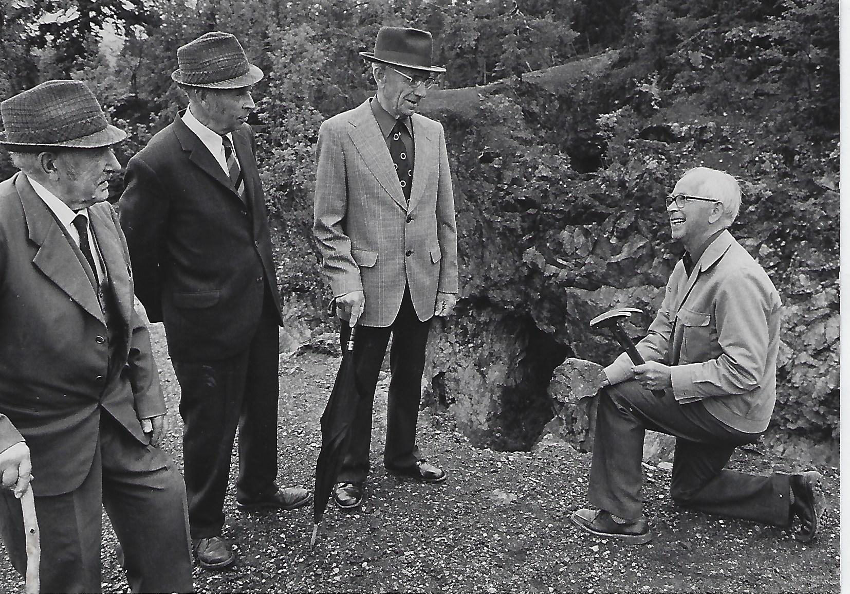 Tekst: Per Runar Thoresen Markadagstur til Konnerudkollen Gruver 16.aug 1975 Fra V: Bjørn Skalstad (tidl. Kjøpmann Skalstad Landhandleri,) Markus Johnsrud ( SKH's først formann),Adolf Stubberud og Lektor Halsen som var fagkyndig og ekspert på Mineraler og malmforekomster.