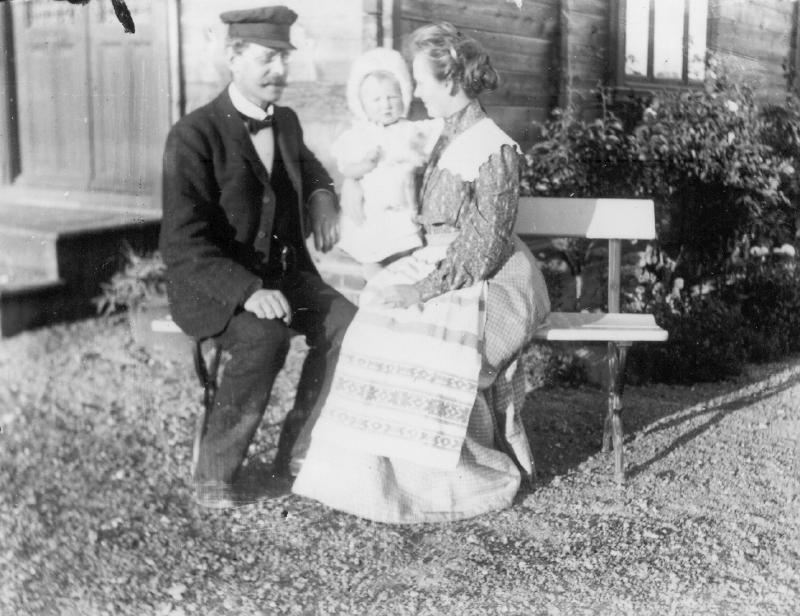 Kristine og Ivar Bjerknes med Helene ved kontorbygningen på tegelverket
