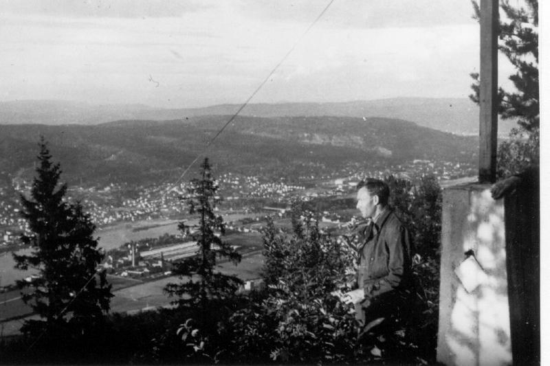Per Grande fra oppmålingsvesnet. Utsikt mot Gulskogen Cellulose, Drammens elva og byen i bakgrunn