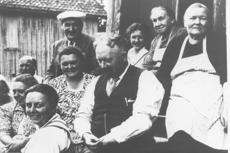 Gruppe på trappa på Fosserud. Fra v. første rekke: Ruth Myrhagen, Helge Myra, Anna Fosserud andre rekke : Gudrun Hoff, Aasta Hoff. Gro Hoff, Mathilde Fosserud bakerst : Signe Myhra, Sverre Hoff, Viktor Hoff.