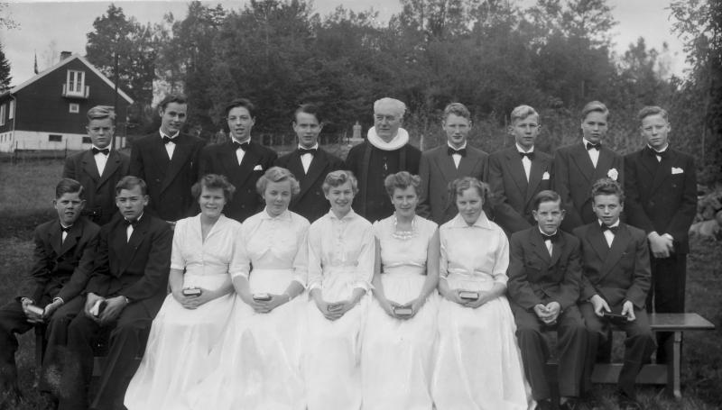 1.rekke foran fra v.: Jan Tollefsen - Arne Hansen - Turid (f) Ebbestad - Unni (f) Langsrud - Inger (f) Simonsen - Gerd (f) Pedersen - Astri (f) Amundsen - Svein Tollefsen og Jan Møller. 2. rekke bak fra.v.: Roar Blomholdt - Jan Erik Ebbestad - Karl Erik Solberg - Jan Otto Gurrik - Prest: Andreas Birkeland. - Henry Solberg - Svein Wike - Steinar Ruud - Petter Brenden.