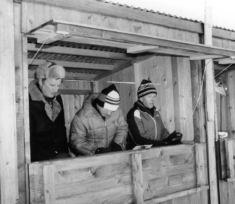 Fra tidtagerboden under ski NM 1978.Fra venstre: Jean Loerange, Ukjent, Harald Kløvstad