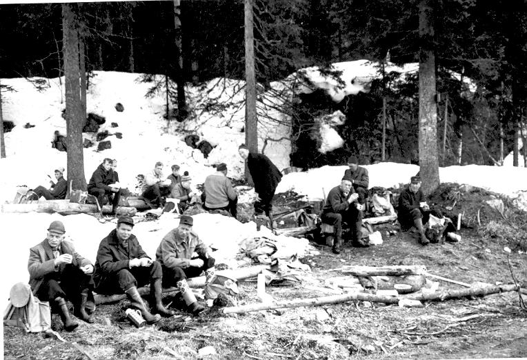Pause under tømmermåling våren 1966. I forgrunnen fra v. P. Stryken, F. Lysaker, G. Båsen. ---- Sandumkarene. Høgberg og Olsen. Videre en skole klasse fra Drammen som er på yrkesorientering.