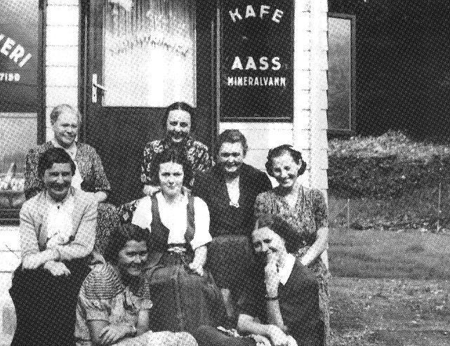 Ruth Myrhagen - ble født og oppvokst på Myrhagen som den yngste av 6 søstre. Hun startet sitt Hjemmebakeri og kafe i 1939 og drev dette fram til 1959. Snippen hjemmebakeri var viden kjent for sine gode hjemmebakte varer. Bildet er tatt ved åpningen sommeren 1939. Kilde: Gro Hoff Rishovd i en artikkel i Konnerud Menighetsblad nr.3 desember 1992.
