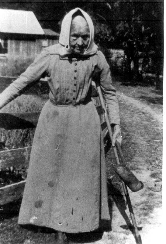 Gamlemor Fosserud, Kari Myrhagen født Olsdatter i Tinn 1831, død 1922. Bilde fra Victor Hoffs album. Bildet er tatt ca, 1920.