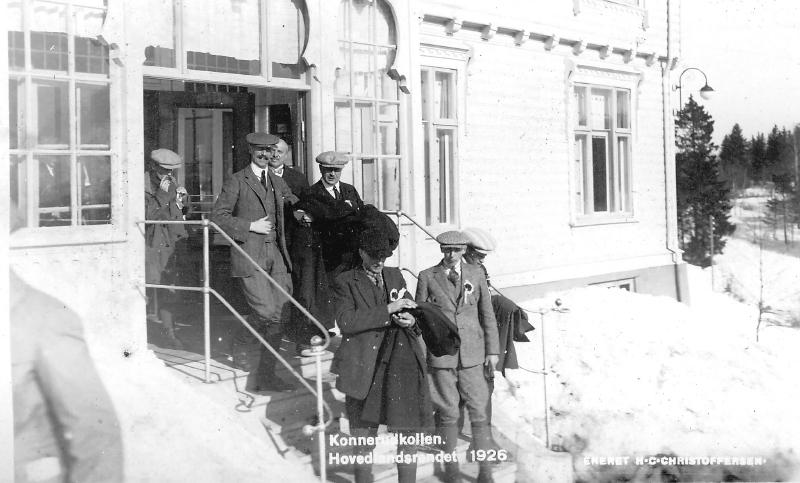 Kong Håkon var tilskuer og gjest under hovedlandsrendet i Konnerudkollen. Han og hans følge bodde på Konnerudkollen Turisthotell i to dager. Bildet er tatt på trappa foran hotellet. Konnerud Sanatorium ble bygget på gården Eskerud i 1896. Byggherre var: Grosserene Brecke, Rudolp og Andersen. Senere overtatt av hotelleier Jens Henriksen fra Tønsberg som utvidet til hotell. Etter første verdenskrig omdøpt til Konnerudkollen Turisthotell, drift til ca. 1940. Etter krigen ble hotellet benyttet som en underavdeling av Univerisitet i Oslo for 107 norske kostholdsstudenter som studerte engelsk over to semestre. De bodde på hotellet sammen med sine lærere. Denne form for college var en ny form for universitet i Norge. Kort varighet, fordi hotellet ble solgt til Europahjelpen i 1949 som mottaksstasjon for flyktninger .Siden brukt til kursted. Hotellet ble ombygd til det ugjenkjennelige i 1950. Staten overtok hotellet vedrlagsfritt i 1951 og det ble brukt som en underavd. til Lier sykehus i 1956. Hotellet brant sommeren 1967.