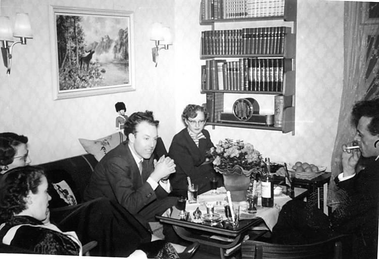Avskjedsselskap i Konnerudgt. 324 for Jørgen Prøis og Berit Thors som skal emigrere til Canada. Jørgen reiste først, noen måneder senere reiste Berit. De giftet seg i Vancouver, B.C. og fikk 2 jenter, Jean Beate (født i 1958) og Liss Irene (født i 1959). De flyttet fra Vancouver til Bella Coola og bodde der et år før de flyttet hjem til Konnerud høsten 1961. Randi Jacobsen, Solveig Tollefsen, Ivar Tveten, Berit Thors (senere gift Prøis), Jørgen Prøis.