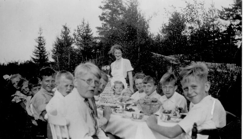På baksiden av bordet. fra H.: Tor Ekholt.- nn- nn-Marit Kari Rustand-Jorunn Prøis ( født Prøis ) Dorthea Thorrud (stående) - På forsiden.: Svein Prøis Echholt - Borgar Echolt ( titter frem ) -nn - Gunnar Prøis -nn- nn- Ole Karl Prøis - Brunsvik. Bidet er tatt i Hauanveien 14. Olaf Echolt sitt nye hus. Fødselsdagsfeiring hos Tjomsland.