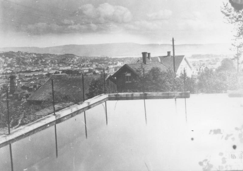 Utsikt fra Øvre Strøm over Drammen. I forgrunnen inntaksdammen på Strøm. Hagletårnet helt til Venstre