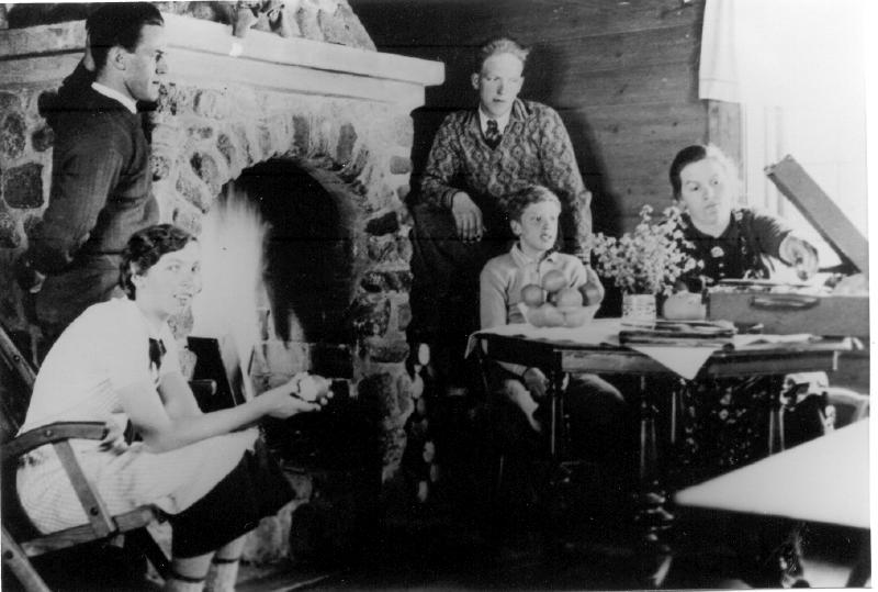 Peisestua - Plassane i påsken 1938. Grammafonen er med. Fra v. Ester Haveråen f. Wold, Olaf Haveråen, Harald Wisting, Sittende : Helge Furuvold, Mathea Wisting f. Haveråen