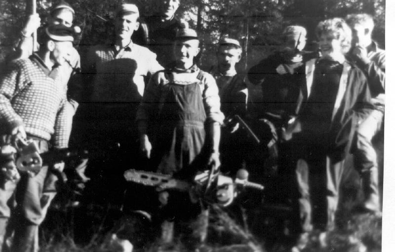 Dugnad på huset til Kjell Amundsen. Fra v. foran: Arne Amundsen, Arnold Amundsen, Inger Thorkildsen ( Amundsen ) Bak fra v. Øyvind Pedersen, Even Engelkor, Helge Amundsen, Kjell Amundsen, Egil Amundsen og Gunnar Thorkilsen