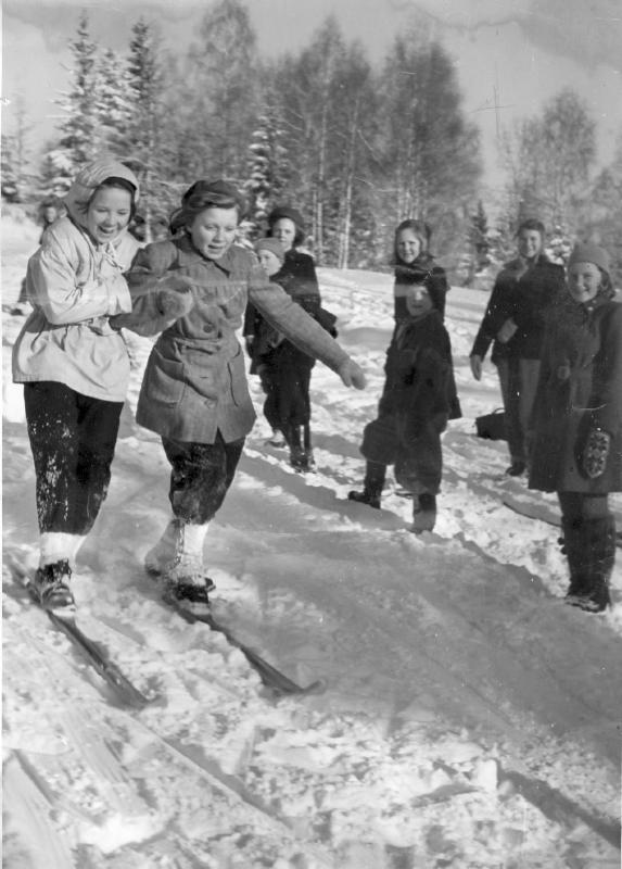 Skoleskirenn på Løvåsjordet. De to på ski er fra .v: Ingger Marie (Tullemor) Løvaas ( søster til Gunnar Løvaas ) til h.: Randi Åsheim f. Svendsrud