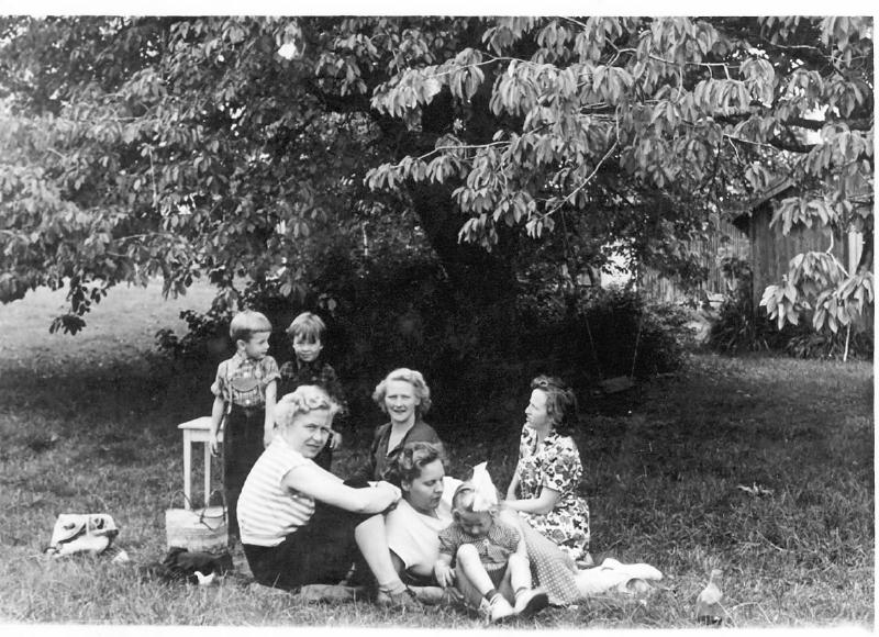 Solveig Markussen f. Berntsen helt til høyre. Gamle Gomperud gård ses helt til høyre. Tuntreet står der fremdeles i 2008.
