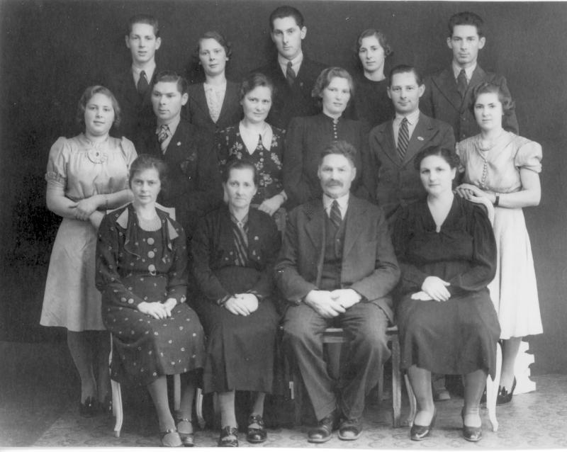 Magna og Martin Solbakken med barna. 1.rekke fra v.: Jenny Larsen - Magna Solbakken - Martin Solbakken - Anna Øgren 2, rekke fra v.: Gerda Hansen - Reidar Solbakken - Gunnar Bergflødt - Ella Pedersen - Kondrad Solbakken - Ragnhild Moe 3.rekke fra v.: Harald Solbakken - Astrid Bertelsen - Artur Solbakken - Alise Larsen - Karl Solbakken
