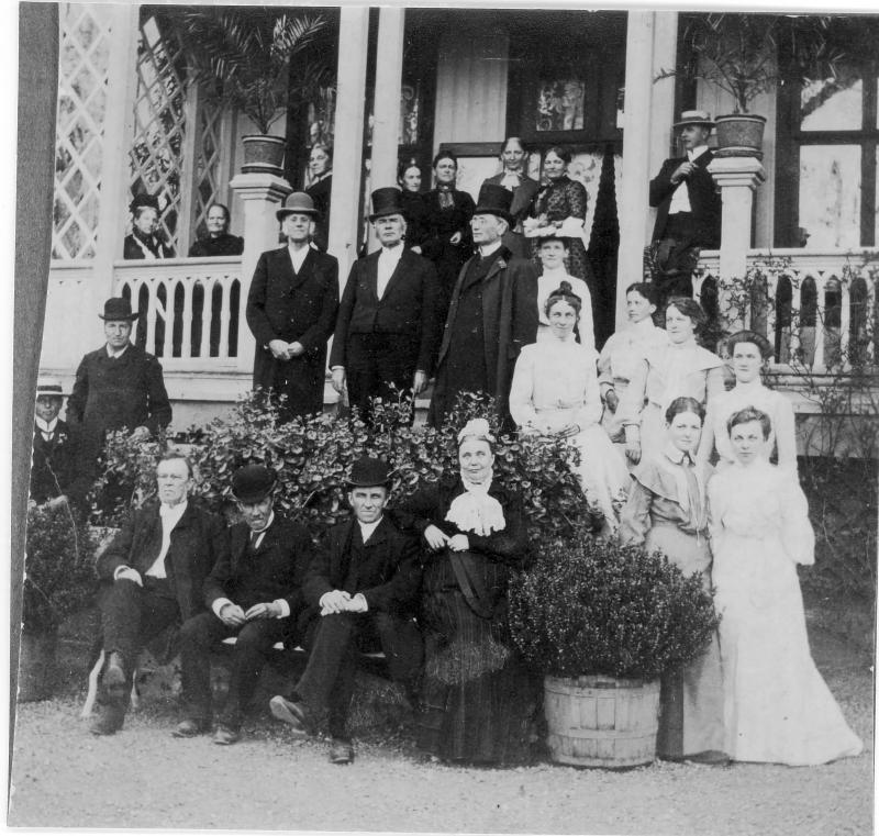 Foto av familien Kiær med gjester på Store Solum den 7.juni 1903. Fra v.: foran Nils O. Kiær med hustru som nr.3 og 4. Stående helt til vensrtre med mørk hatt: Hans Sveen, som dengang var lærer på Eikhaugen skole, senner som lensmann i Skoger. Av de 3 herrer med flosshatt som står på trappen er prost Peder O. Megrund ( i midten ) Til høyre for han er Stiftsprost Gustav Jensen ( kjent for sitt arbeid med Lanstads reviderte salmebok) Den lille mørke unge damen midt foran verandadøren er Magdalene Megrund