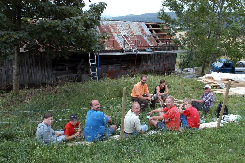 ..Fra v: Marie Engen, Fredrik Engen, pappa Stein Engen, bestefar Gunnar Engen , Per Borge og Eivind Borge, Mot fotografen: Morten Hyllseth og eier av saga Linda Skjeldrum og lengst til h. Jørgen Skjeldrum som har eid og jobbet på og med saga i en mannsalder. (oh)